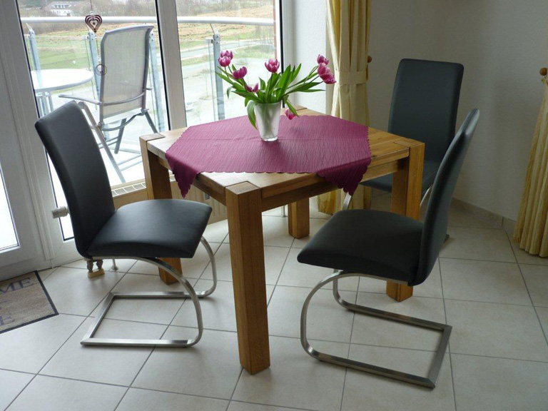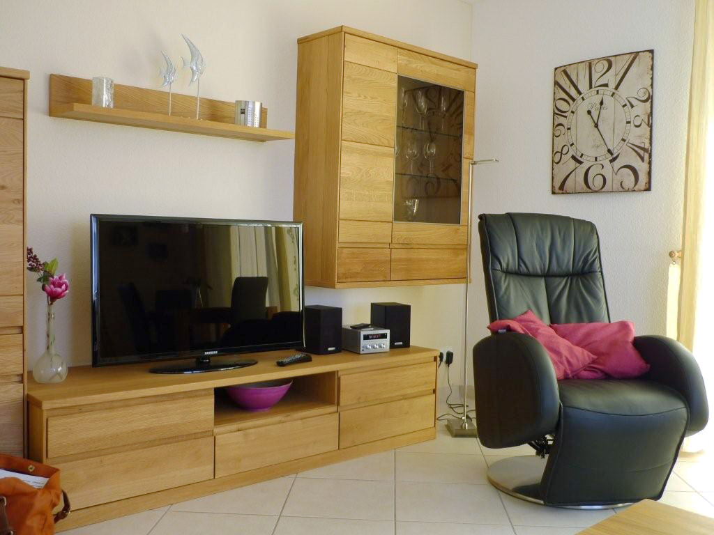 Wohnzimmer: Wohnelemente hängend/stehend mit TV /Schrank aus Wildeiche. Eckcouchgarnitur mit großem Couchtisch. Ledersessel mit Hocker. Eßtisch mit Freischwinger. Angepasste Dekoration mit Küstenmotiven. LED Fernseher (40 “). Mini HIFI Musikanlage mit USB Anschluss und Dockstation für i Phone.