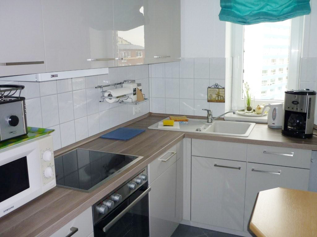 Küche: Separate Einbauküche mit kleinem Eßplatz. Ausgestattet ist sie mit Kühl/Gefrierschrank. Elektroherd mit Glaskochfeld und Backofen, Mikrowelle, Kaffeemaschine, Toaster, Wasser und Eierkocher, ausreichend Geschirr, Besteck, Gläser, Töpfe und Pfannen.